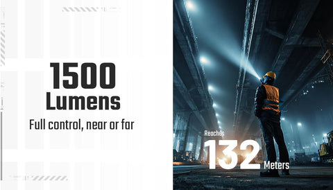 - Slim and stylish flashlight with 1500 Lumen max output.132 Meter beam throw.